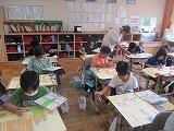 1年生音楽では、「せんりつでよびかけあおう」の学習です。呼びかけ役とこたえ役に分かれて、旋律を工夫しながら活動しています。2年生総合では、「おみせやさんごっこ」のリハーサルをしています。お店屋さんとお客さんの役を交代しながら行い、活動の工夫を考えています。