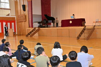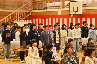 歓迎の言葉と校歌斉唱 6年生、ありがとうございました。