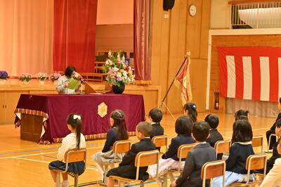 8名の先生方が着任しました。 2名の児童が新学期の抱負を述べました。