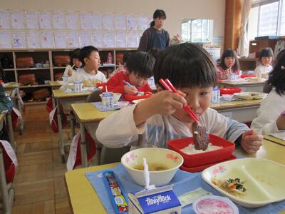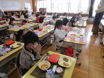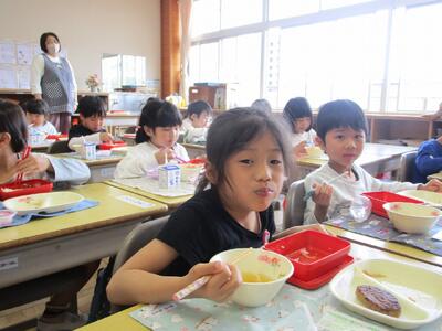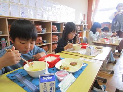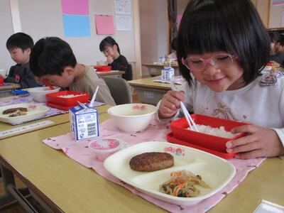 1年生、給食開始です 投稿: 承認者 (19:13) 1年生の給食が始まりました。「おいしい!」と大喜びでした。 「いただきます!」 ハンバーグがおいしかったです。 「ごはんが好き」という子が多いです。 よく噛んで食べました。 Tweet -